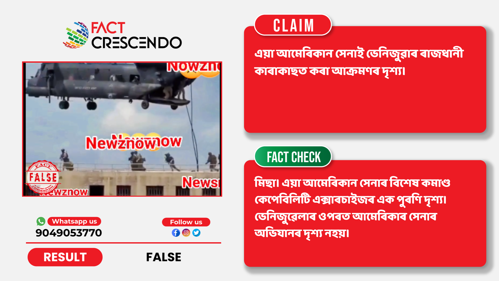 ইয়াৰ পৰাই আমি নিশ্চিত হওঁ যে যে অসমৰ ফেচবুক একাউণ্টটোৱে কৰা দাবীটো সত্য নহয়। এয়া আমেৰিকান সেনাৰ বিশেষ কমাণ্ড কেপেবিলিটি এক্সাৰচাইজৰ এক পুৰণি দৃশ্য। ভেনিজুৱেলাৰ ওপৰত আমেৰিকাৰ সেনাৰ অভিযানৰ দৃশ্য নহয়।