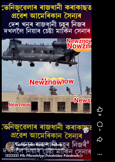 শেহতীয়াকৈ অসমৰ এটা ফেচবুক একাউণ্টত এটা ভিডিঅ’ আপলোড কৰি সেয়া আমেৰিকান সেনাই ভেনিজুৱেলাৰ ৰাজধানী কাৰাকাছত প্ৰৱেশ কৰা শেহতীয়া দৃশ্য বুলি দাবী কৰিছে। দৃশ্যটোৰ ওপৰত লিখিছে- ভেনিজুৱেলাৰ ৰাজধানী কাৰাকাছত প্ৰৱেশ আমেৰিকান সৈন্যৰ।দেশখনৰ ৰাজধানী চহৰ নিজৰ দখললৈ নিয়াৰ চেষ্টা মাৰ্কিন সেনাৰ।